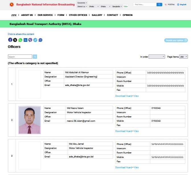 National Information Broadcasting এবং BRTA-এর অফিসিয়াল ওয়েবসাইটে (brta.gov.bd ও Dhaka সার্কেলের পেজ) ঢাকা জেলা সার্কেলের অফিসারদের (সহকারী পরিচালক, মোটরযান পরিদর্শক ইত্যাদি) নাম, পদবি ও ইমেইল প্রকাশিত থাকলেও মোবাইল নম্বর সম্পূর্ণ অনুপস্থিত বা ইচ্ছাকৃতভাবে মাস্ক করা (যেমন: ১৯১১১১১১১১১)। ফলে জরুরি প্রয়োজনে সংশ্লিষ্ট অফিসারের সাথে আগাম যোগাযোগ করা একেবারে অসম্ভব হয়ে পড়েছে।