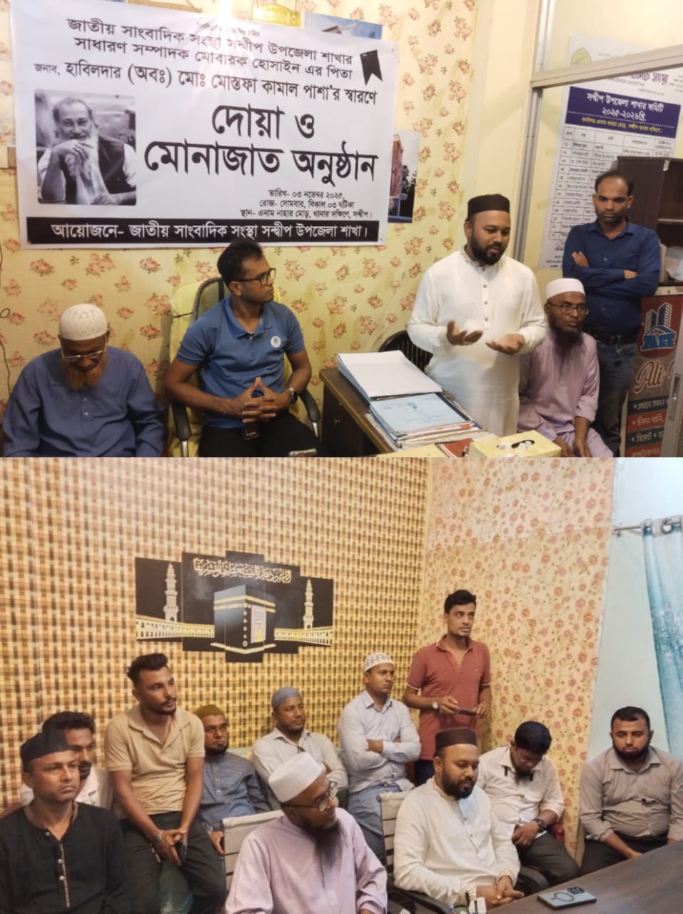 জাতীয় সাংবাদিক সংস্থা সন্দ্বীপ উপজেলা শাখার সাধারণ সম্পাদক মোবারক হোসাইনের পিতা হাবিলদার (অব.) মোস্তফা কামাল পাশার রুহের মাগফিরাত কামনায় দোয়া ও মুনাজাত অনুষ্ঠিত হয়েছে। সোমবার (৩ নভেম্বর) সন্ধ্যা ৭টায় এনাম নাহার মোড়স্থ সংগঠনের কার্যালয়ে এ দোয়া মাহফিল অনুষ্ঠিত হয়।