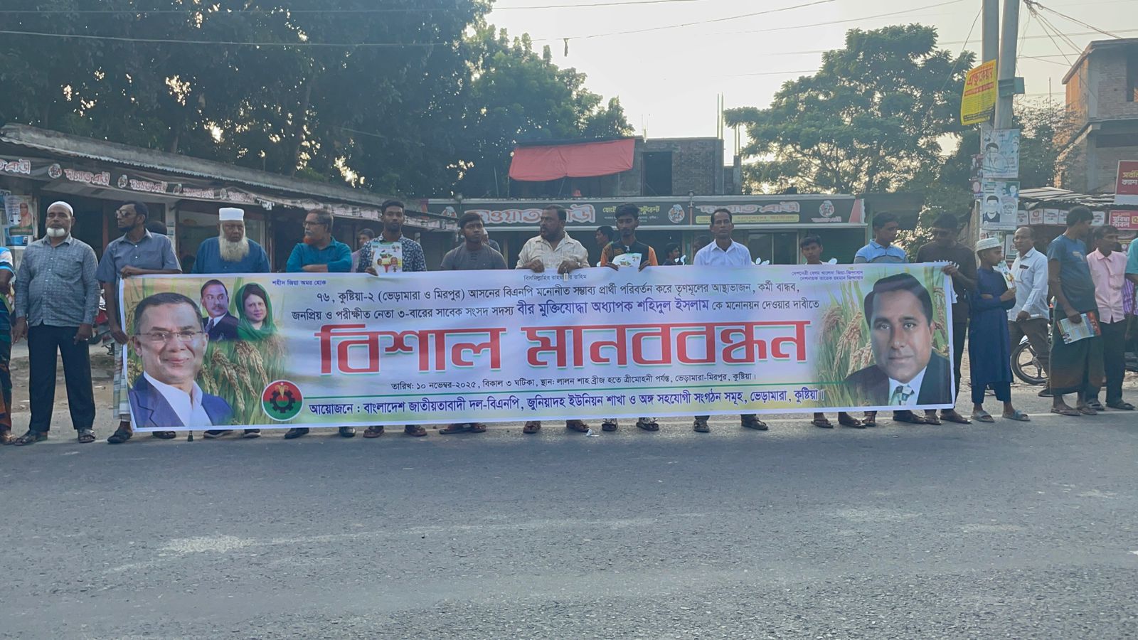 আগামী জাতীয় সংসদ নির্বাচনে বিএনপি থেকে অধ্যাপক শহীদুল ইসলাম কে মনোনয়ন দেওয়ার দাবীতে এখন উত্তাল কুষ্টিয়া-২ আসন। গতকাল রবিবার দুপুর ৩টা থেকে লালন শাহ্ ব্রীজ থেকে কুষ্টিয়ার ত্রি মোহনী পর্যন্ত প্রায় ২২ কিলোমিটার রাস্তা জুড়ে নজির বিহীন মানববন্ধন কর্মসূচী পালন করেছে শহীদুল ইসলাম সমর্থক নেতাকর্মীরা। মানববন্ধনে নেতৃত্ব দেন কুষ্টিয়া-২ (ভেড়ামারা-মিরপুর) আসনের সাবেক সংসদ সদস্য, কুষ্টিয়া জেলা বিএনপির সাবেক সভাপতি, বীরমুক্তিযোদ্ধা অধ্যাপক শহীদুল ইসলাম। ভেড়ামারা অংশে ছিলেন, ভেড়ামারা উপজেলা বিএনপির আহবায়ক এ্যাড. তৌহিদুল ইসলাম আলম এবং মিরপুর অংশে ছিলেন, উপজেলা বিএনপির সদস্য সচিব খন্দকার টিপু সুলতান। ব্যাতিক্রমি এই মানববন্ধনে ভেড়ামারা-মিরপুর উপজেলার হাজার হাজার নেতা-কর্মী-সমর্থকরা অংশনেন। এসময় তাদের হাতে বেগম খালেদা জিয়া, তারেক রহমান, অধ্যাপক শহীদুল ইসলামের ছবি সংবলিত বিভিন্ন প্লাকার্ড, ফেষ্টুন দেখা যায়। সেখানে রাজপথের শহীদুল, আমরা তোমায় ভুলি নাই। হামলা মামলার স্বীকার শহীদুল ভাই, আমরা তোমায় ছাড়ি নাই, আন্দোলনের শহীদুল ভাই, ভেড়ামারা মিরপুরের শহীদুল ভাই, আমরা তোমায় ভুলি নাই সহ ব্যাতিক্রমী নানা শ্লোগান লিখা ছিল। মানববন্ধন ঘিরে ২ টি মঞ্চ তৈরী করা হয়। ১টি ভেড়ামারার অংশে, আরেকটি মিরপুরের অংশে ত্রিমোহনীতে।