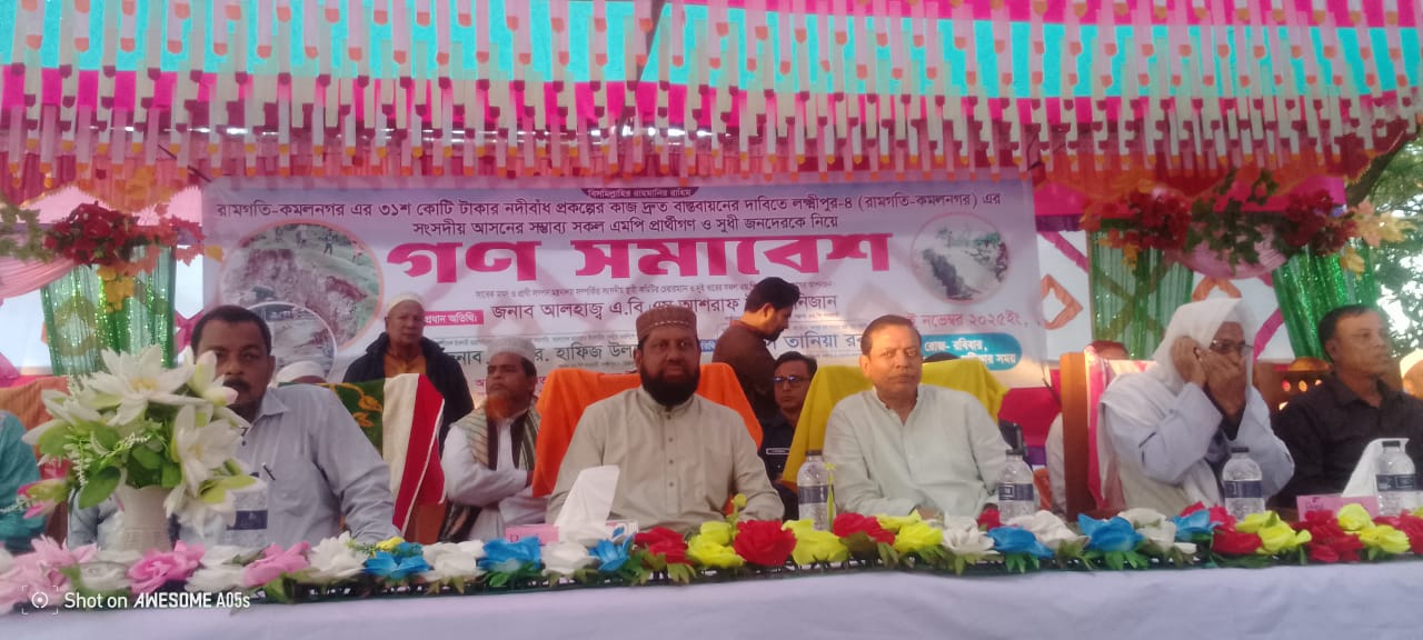 লক্ষ্মীপুর জেলার রামগতি ও কমলনগর উপজেলার ভয়াবহ নদী ভাঙন রোধে ৩১০০ কোটি টাকার নদীবাঁধ প্রকল্পের দ্রুত বাস্তবায়নের দাবিতে লক্ষ্মীপুর-৪ (রামগতি–কমলনগর) আসনের সম্ভাব্য সকল এমপি প্রার্থীদের নিয়ে এক বিশাল গণসমাবেশ অনুষ্ঠিত হয়েছে। নদীভাঙনে ক্ষতিগ্রস্ত মানুষের টিকে থাকার আকুতি তুলে ধরতেই প্রথমবারের মতো বিভিন্ন রাজনৈতিক দলের সম্ভাব্য প্রার্থীরা একই মঞ্চে একত্রিত হন।