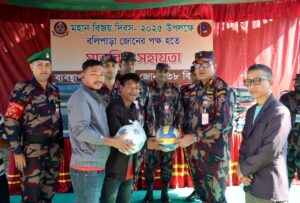 মঙ্গলবার (১৬ ডিসেম্বর) মহান বিজয় দিবস কর্মসূচির উপলক্ষে স্থানীয় ৩০০ জন অসহায়, দরিদ্র ও শীতার্ত মানুষের মাঝে শীতবস্ত্র ৩০০টি কম্বল বিতরণ করা হয়। শীত মৌসুমে সুবিধাবঞ্চিত জনগোষ্ঠীর কষ্ট লাঘবের লক্ষ্যে বলিপাড়া জোন (৩৮ বিজিবি) নিয়মিতভাবে এ ধরনের জনকল্যাণমূলক ও মানবিক সহায়তা কার্যক্রম পরিচালনা করে আসছে।