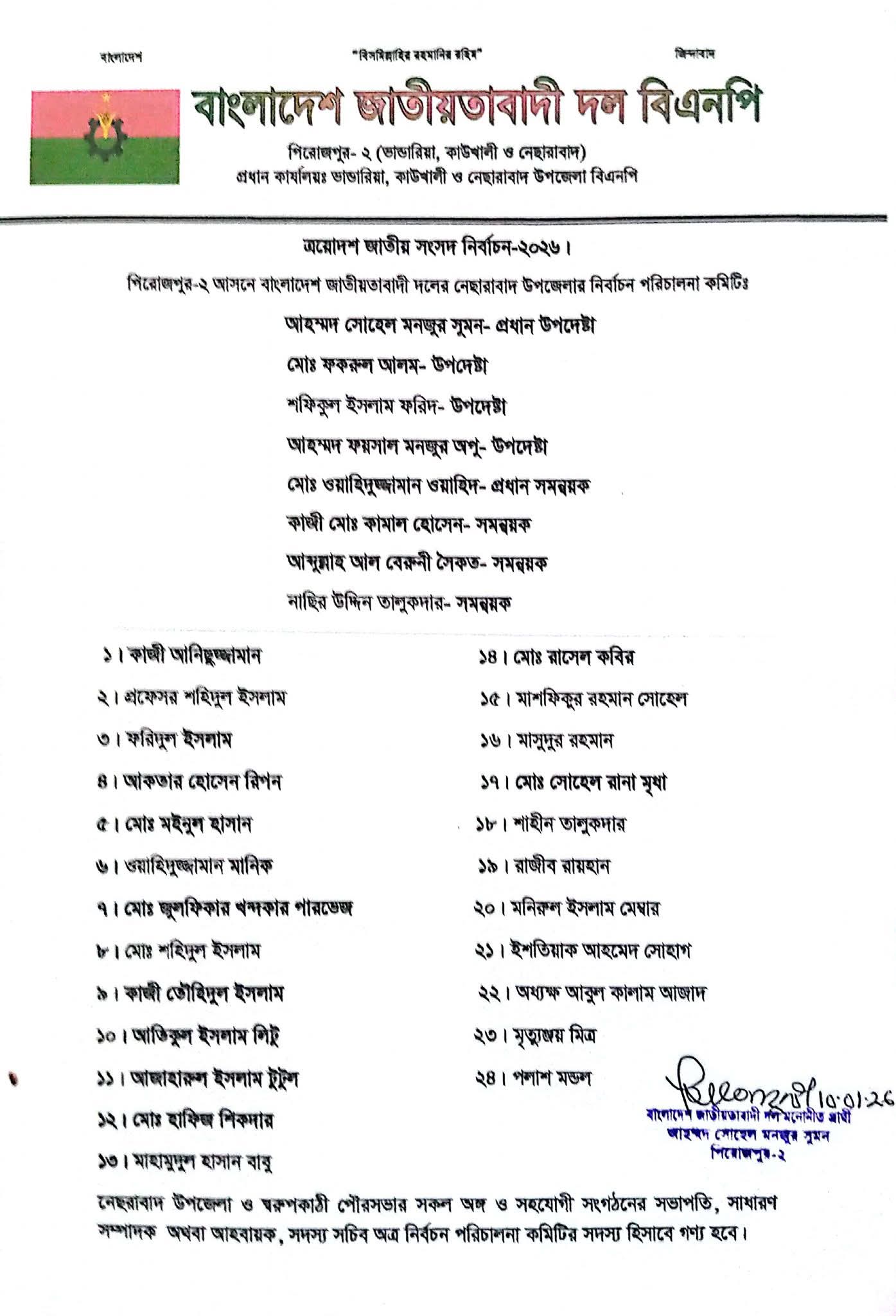 ধানের শীষের প্রার্থী আহম্মদ সোহেল মঞ্জুর সুমন স্বাক্ষরিত দলীয় প্যাডে ২৪ সদস্য বিশিষ্ট এই কমিটি গঠন করা হয়। এসময় উপজেলার প্রায় সকল নেতৃবৃন্দ উপস্থিত ছিলেন।