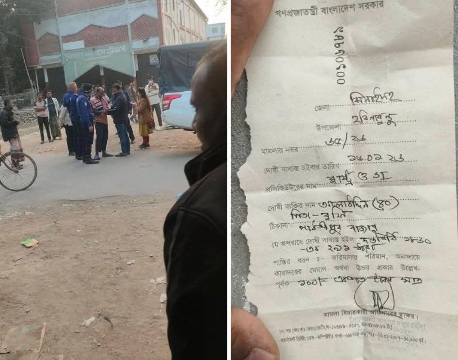 ঝিনাইদহের হরিনাকুন্ডু উপজেলার পৌরসভা এলাকায় রাস্তার পাশে খোলা জায়গায় দাঁড়িয়ে প্রশাব ফেরার অপরাধে ১০০ টাকা জরিমানা।