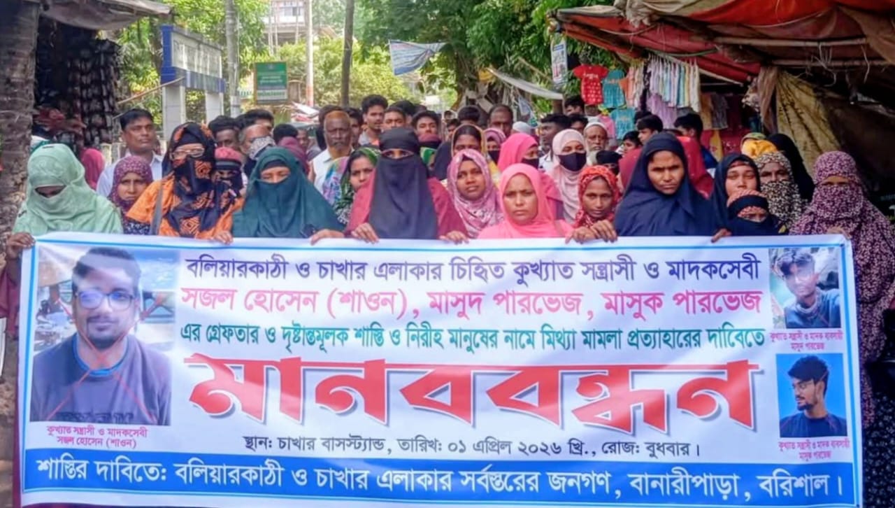 বরিশালের বানারীপাড়া উপজেলার চাখার ইউনিয়নের বলিয়ার কাঠি গ্রামে পারিবারিক জমি-জমা সংক্রান্ত বিরোধকে কেন্দ্র করে মোঃ সজল হোসেন শাওনের বিরুদ্ধে মানববন্ধন অনুষ্ঠিত হয়েছে।