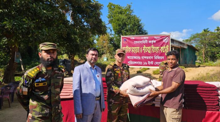 রেমবো ত্রিপুরা, থানচি (বান্দরবান) প্রতিনিধি: বিজয়ের মাসে পার্বত্য জেলা বান্দরবানের রুমা উপজেলার সীমান্তবর্তী দুর্গম পাহাড়ি এলাকায় ১০টি পাড়ার অসহায় ও দরিদ্র ক্ষুদ্র নৃ-গোষ্ঠী সম্প্রদায়ের মাঝে শীতবস্ত্র বিতরণ করেছে বাংলাদেশ সেনাবাহিনী। আরও পড়ুন...