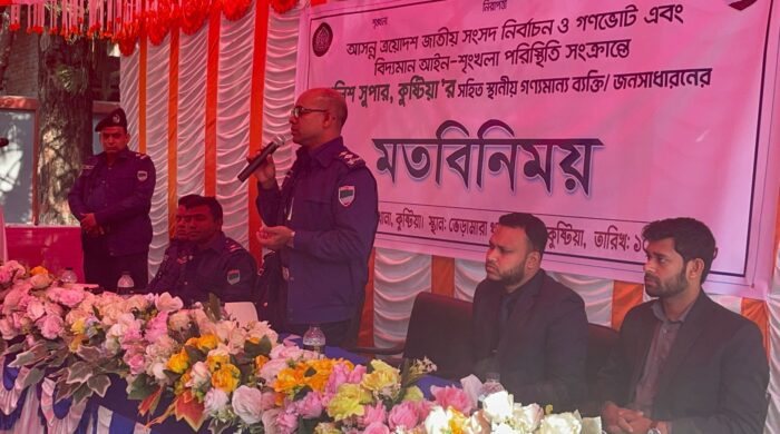 মোহন আলী স্টাফ রিপোর্টার কুষ্টিয়া। কুষ্টিয়া ভেড়ামারা থানার আয়োজনে আসন্ন ত্রয়োদশ জাতীয় সংসদ নির্বাচন ও গণভোট এবং বিদ্যমান আইন-শৃংখলা পরিস্থিতি সংক্রান্তে কুষ্টিয়া পুলিশ সুপার মোহাম্মদ জসীম উদ্দিন এর সাথে বিভিন্ন