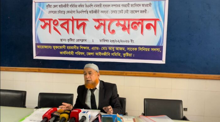 মোহন আলী স্টাফ রিপোর্টার কুষ্টিয়া ঃ কুষ্টিয়া, ২২ ফেব্রুয়ারি’ ২০২৬: কুষ্টিয়া আইনজীবী সমিতির আসন্ন নির্বাচনকে ঘিরে এক আইনজীবীর সদস্যপদ খারিজের অভিযোগ উঠেছে। আজ রোববার বেলা ১টায় কুষ্টিয়া প্রেসক্লাবে সংবাদ সম্মেলনে