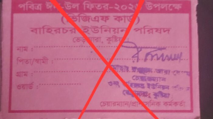 স্টাফ রিপোর্টার কুষ্টিয়া ঃ কুষ্টিয়ার ভেড়ামারা উপজেলার বাহিরচর ইউনিয়ন পরিষদে ঈদুল ফিতর ২০২৬ উপলক্ষে ভিজিএফ চাউলের কার্ড বন্টনের অভিযোগ যেখানে এমপির বরাদ্দ ১৫% ও বিএনপি ১৫% অবশিষ্ট ৭০% পার্সেন্ট হতদরিদ্র